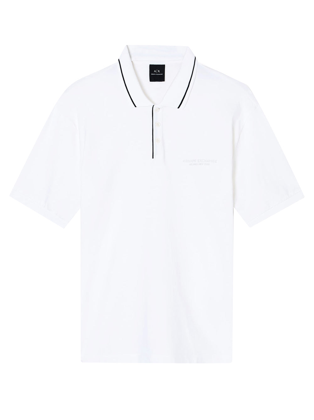 - Dettaglio lettering Armani Exchange Milano / New York tono su tono sul petto