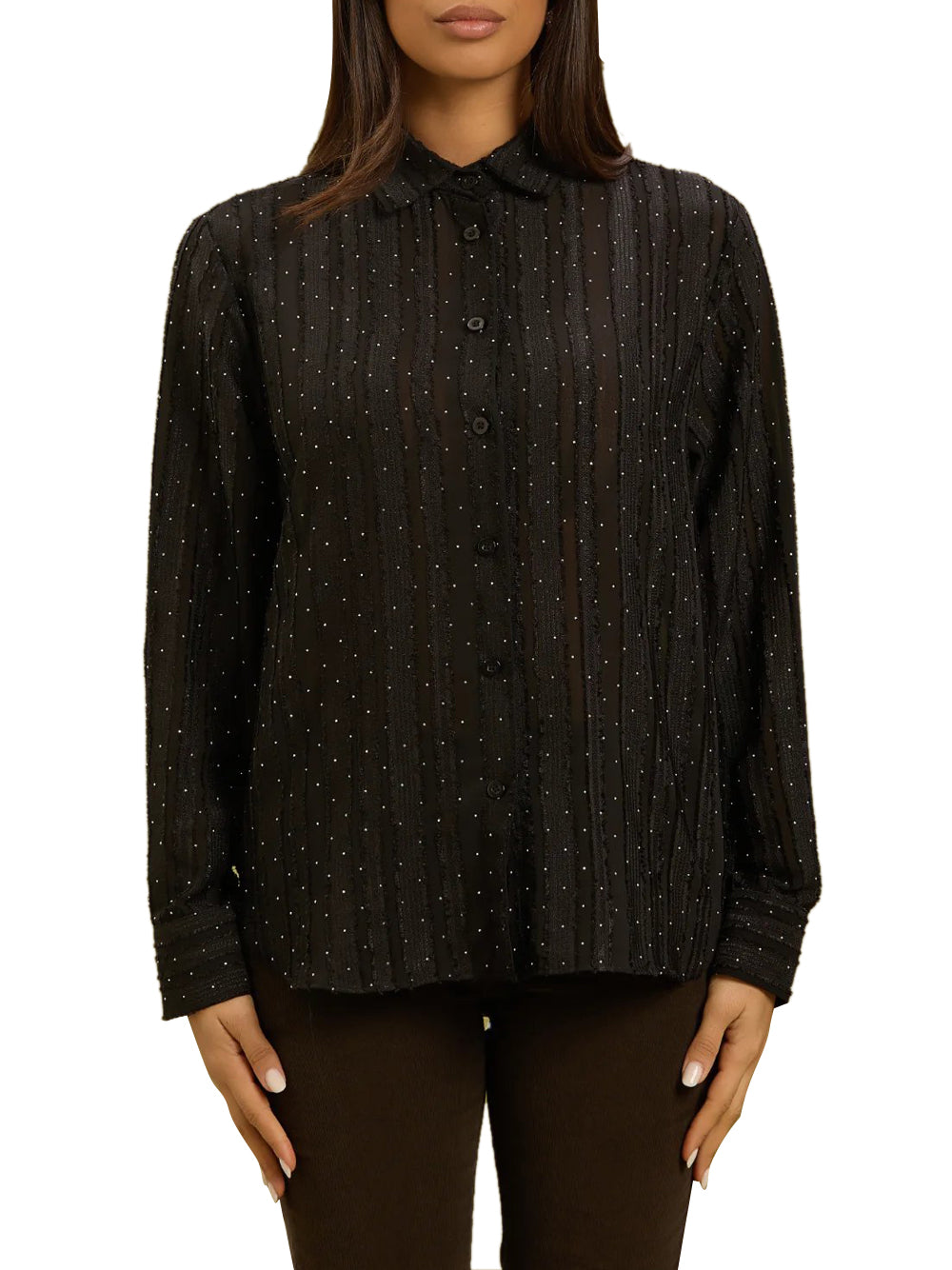La camicia con strass nera di Take Two è pensata per la donna moderna che non rinuncia a un tocco di glamour. Questo capo unisce un design elegante alla praticità, risultando ideale per serate o eventi speciali. La leggera lucentezza degli strass esalta il colore nero, aggiungendo un fascino sofisticato.