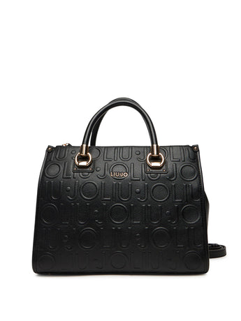 La borsa a mano da donna Liu Jo è l'accessorio perfetto per essere alla moda in ogni occasione. Realizzata in nero con stampa effetto bottalato, presenta comodi manici e una tracolla regolabile e rimovibile. Con due scomparti con zip, una tasca interna con zip e piedini metallici al fondo, offre praticità e stile. Il logo a rilievo all over e il chiusura con bottone magnetico la rendono unica.
