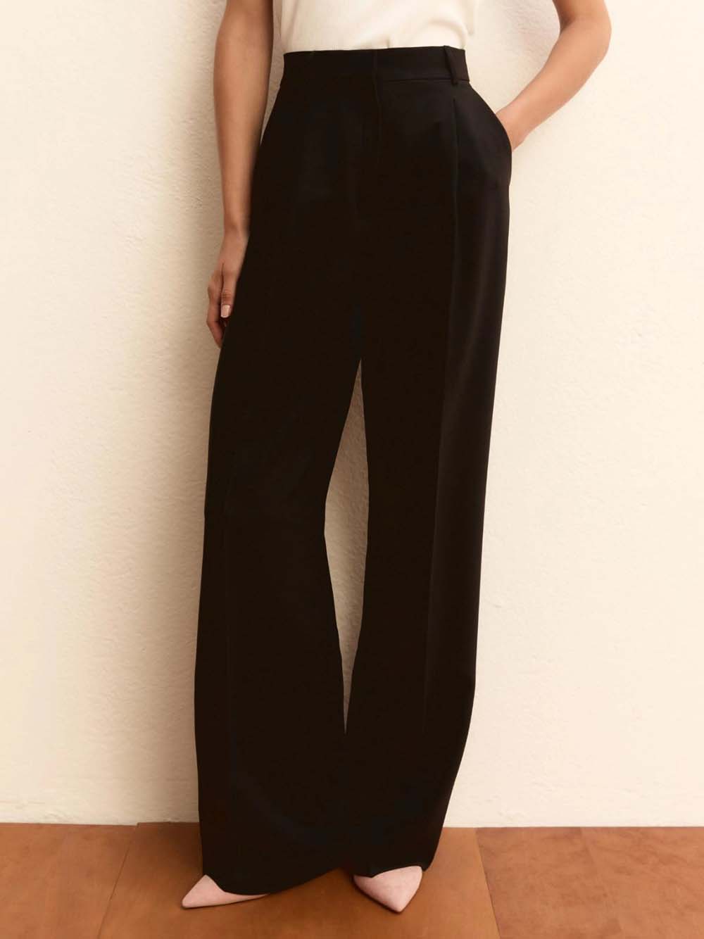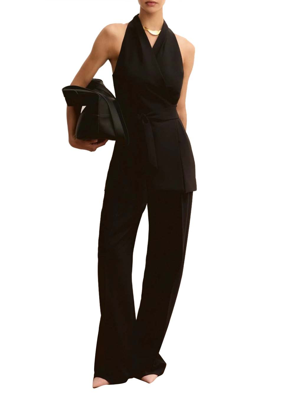 Completo Emme Marella in nero per una donna elegante e moderna. Questo raffinato completo presenta un top smanicato incrociato con fusciacche annodabili in vita e ampi pantaloni fluido bistretch con pince sul davanti. Unisce comfort e stile, perfetto per chi cerca un look sofisticato e versatile per varie occasioni.