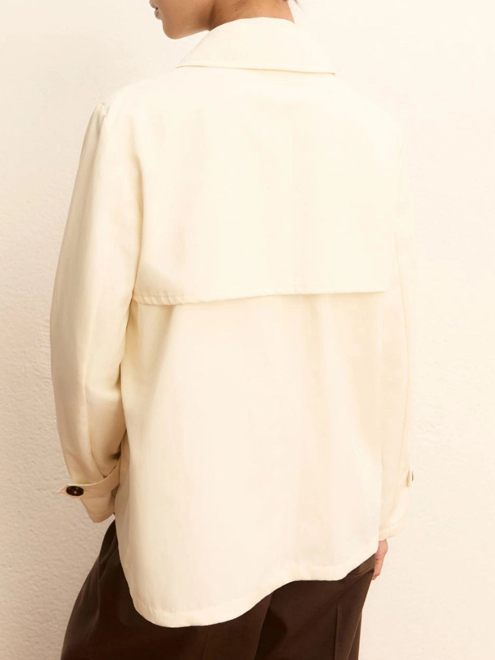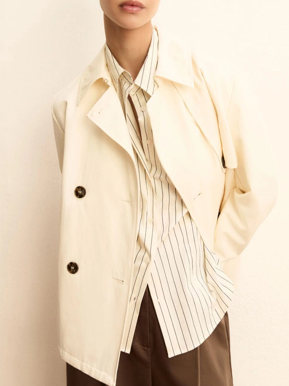 - Abbottonatura a doppiopetto e bavoletta sul davanti