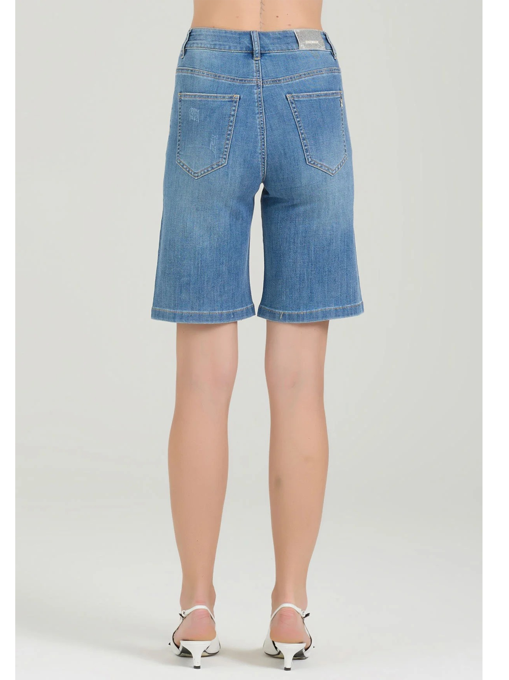 I Bermuda Brook di Take Two, pensati per la donna dinamica e attenta allo stile, sono caratterizzati da strisce con strass che donano un tocco glamour al denim di media tonalità. Perfetti per chi ama un look casual ma con dettagli sofisticati, questi Bermuda combinano comfort e fascino con un design moderno ed elegante.