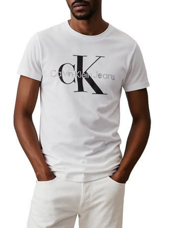 La t-shirt con monogramma Slim di Calvin Klein rappresenta l'ideale per l'uomo moderno in cerca di stile e comfort. Questo capo è caratterizzato da un design girocollo e maniche corte, arricchito da un logo stampato su fondo bianco, perfetto per aggiungere un tocco di eleganza al tuo guardaroba quotidiano.