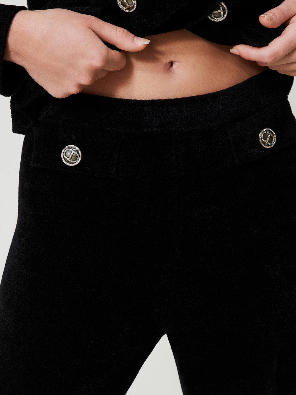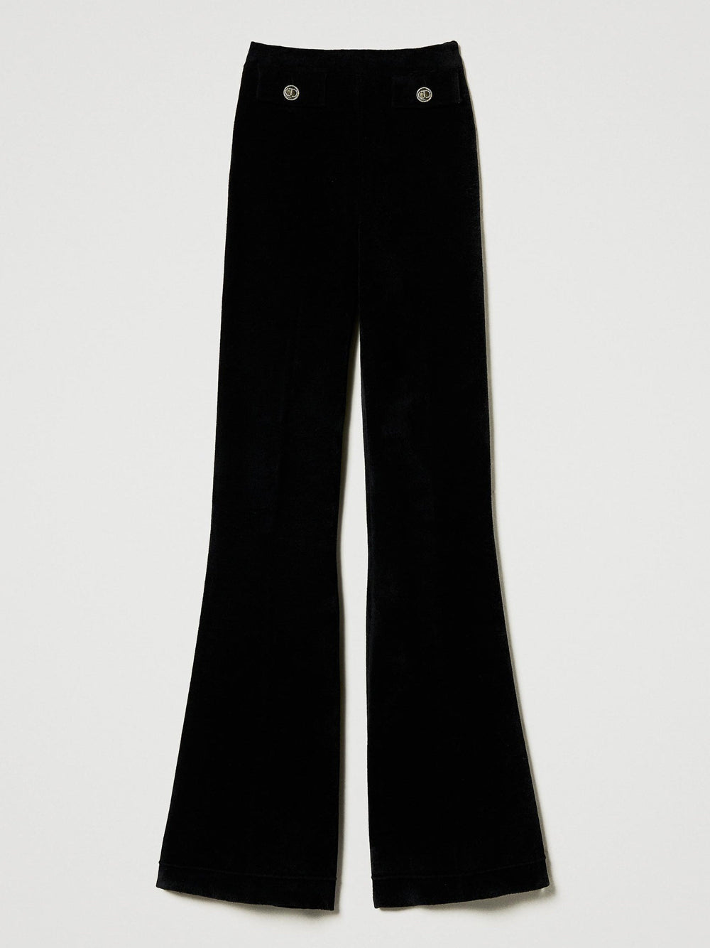 Sperimenta lo stile elegante e sofisticato con questi Pantaloni Zampa Twin Set in maglia nera. Con dettagli come bottoni Oval T e spacchi sul fondo, questi pantaloni sono perfetti per un look da festa o per un'occasione speciale. Realizzati in viscosa mista, sono comodi e alla moda.