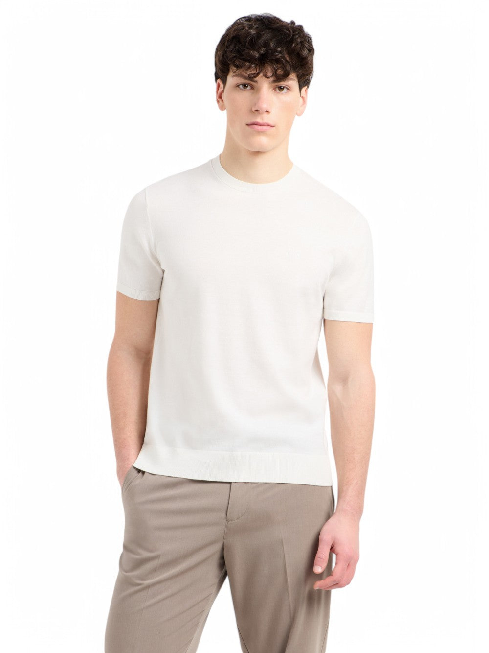 Perfetta per ogni occasione, la T-shirt in maglia di Armani Exchange unisce eleganza e funzionalità, offrendo al contempo un tocco di lusso e una spinta alla sostenibilità grazie al suo tessuto di cotone organico. Indossala per un look casual-chic che non passa inosservato.