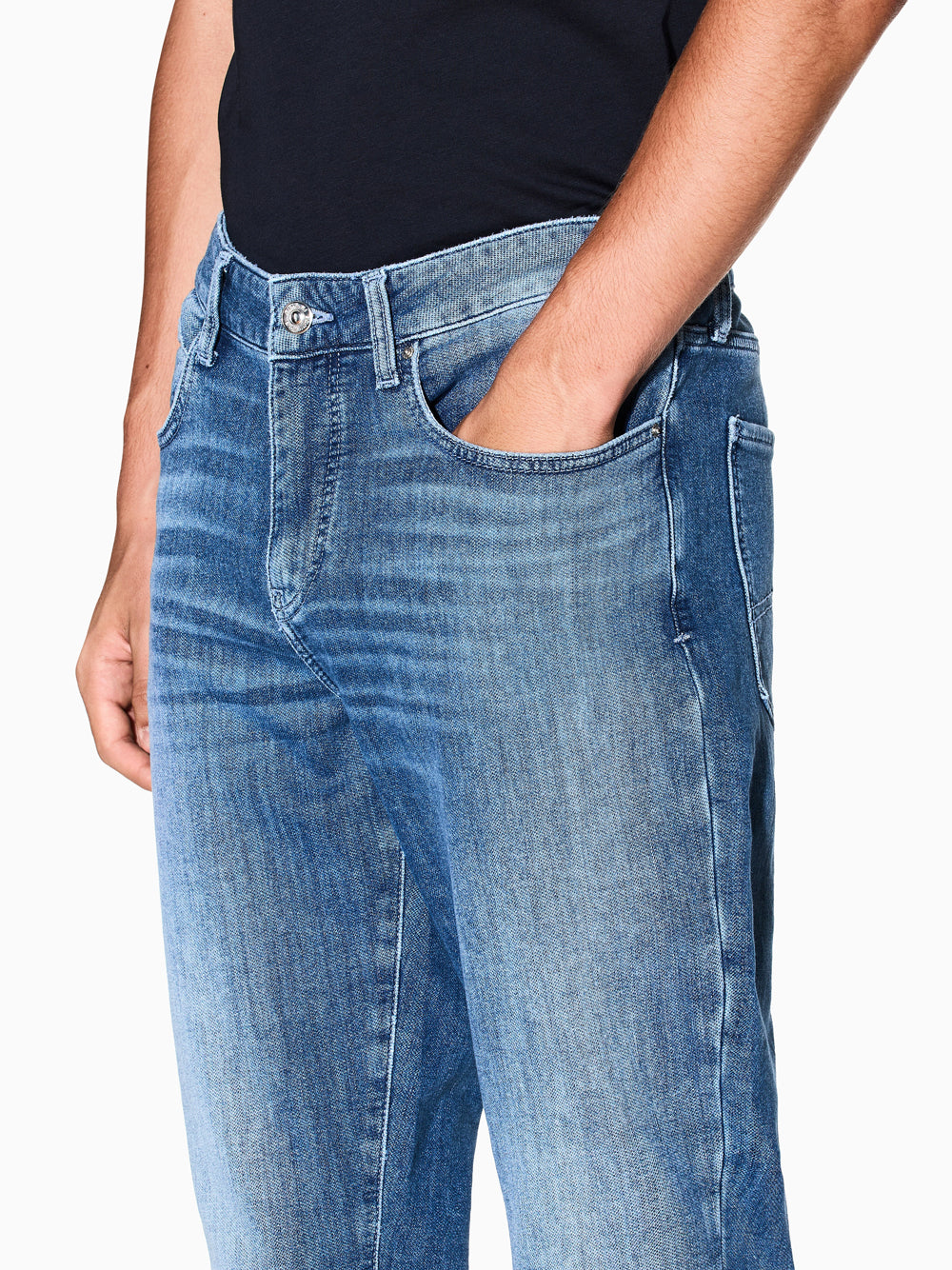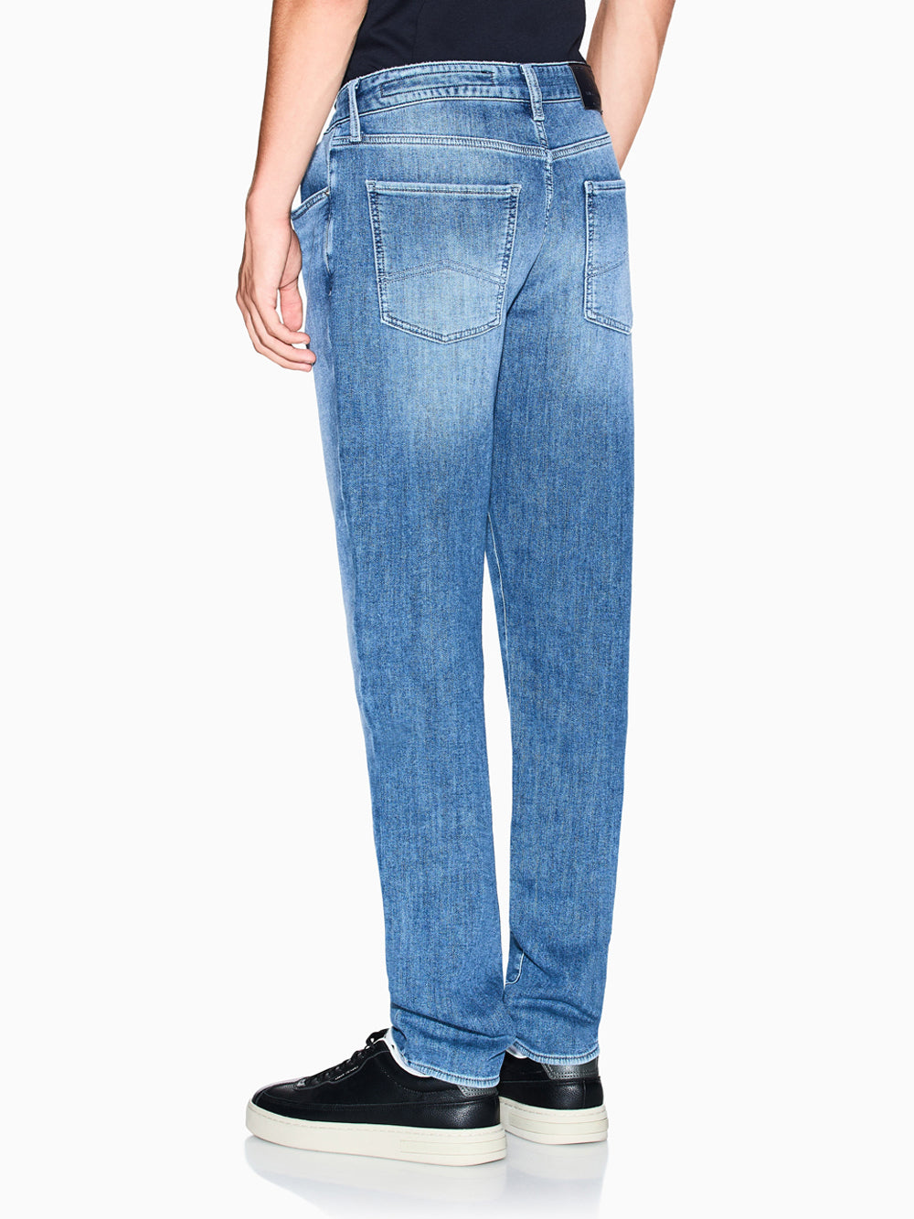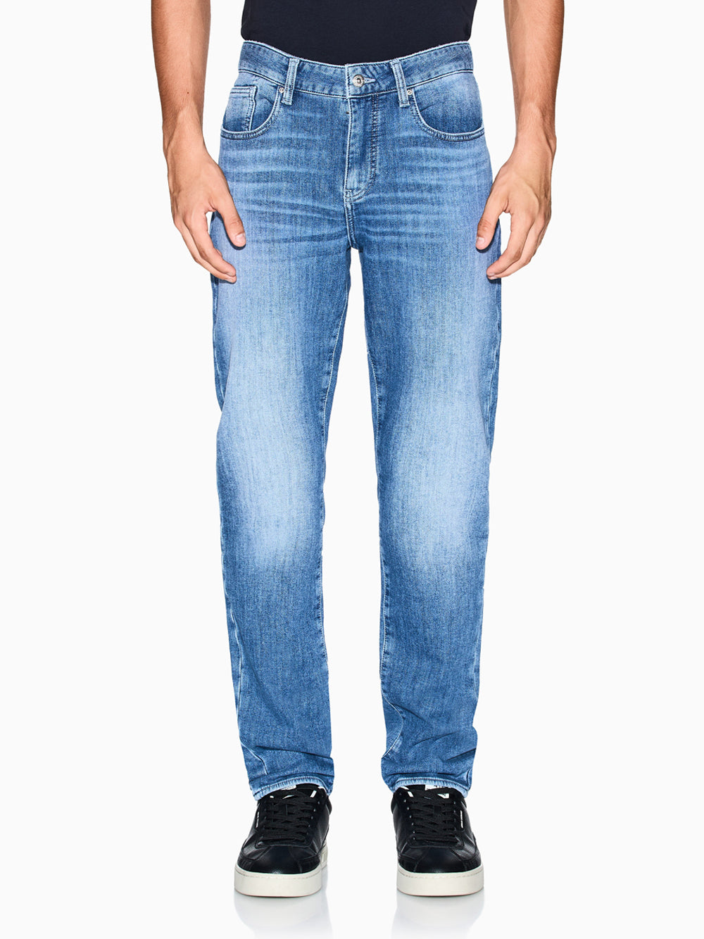 Jeans Skinny Armani Exchange da Uomo - Denim. Jeans cinque tasche in denim fleece stretch di alta qualità, con fit slim che valorizza la silhouette. Dettagli délavé per un look sofisticato e casual. Chiusura con zip e bottone logato, logo A|X ricamato su tasca frontale. Passanti per cintura e impunture tono su tono. Per un guardaroba maschile contemporaneo.