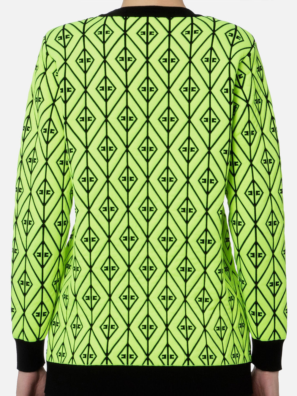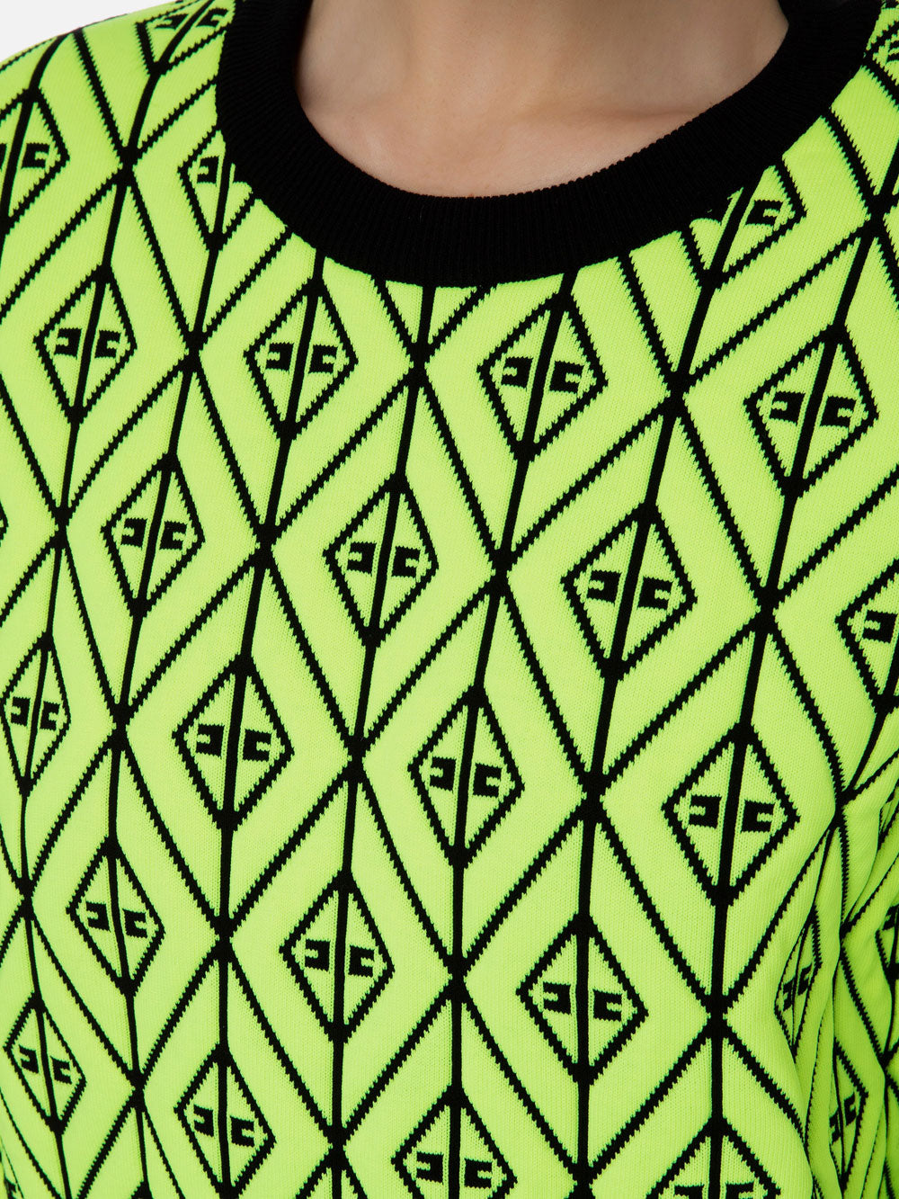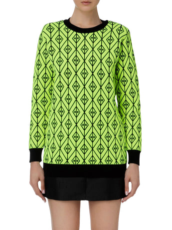 Pullover oversize in maglia con tessitura tecnica, effetto embossed-matelassé. A costine e con contrasto di colore Lime Fluo/Nero. Spalline imbottite.