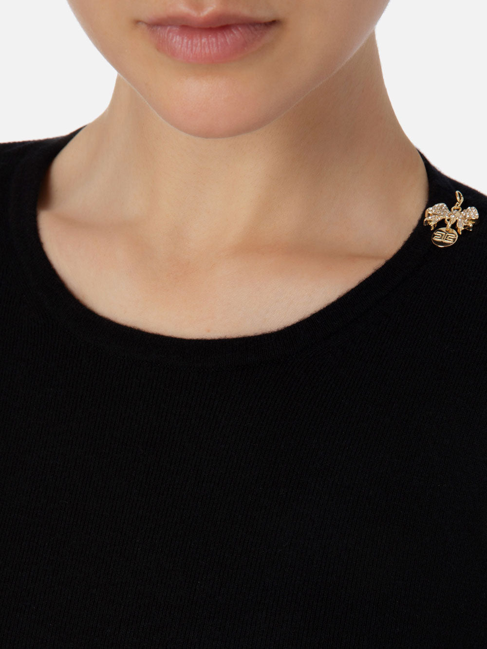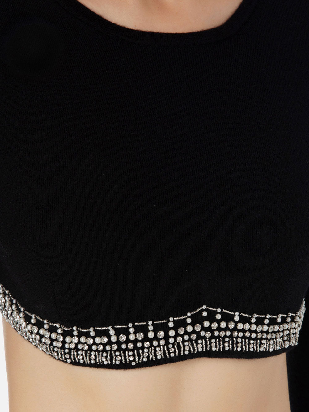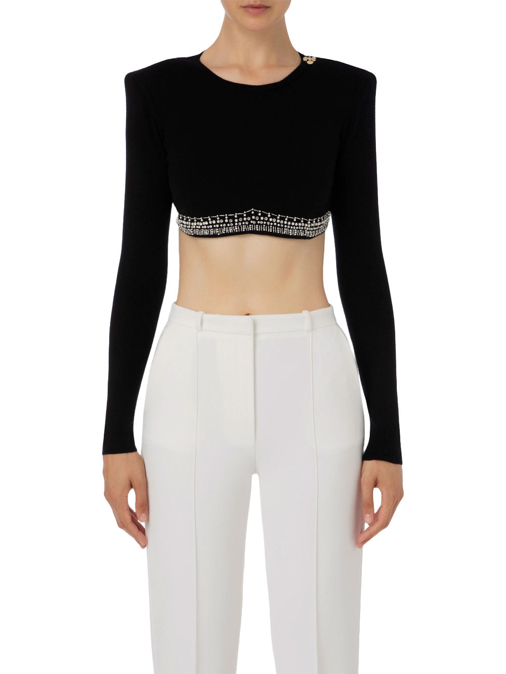 Realizzato in un lussuoso misto di lana e viscosa, questo top a maniche lunghe è un capo di alta moda. Il design cropped aggiunge un tocco di modernità, mentre il girocollo offre un look elegante. Le spalline imbottite conferiscono una silhouette strutturata, mentre il ricamo a mano di perle, strass e canottiglie sotto il seno è un lavoro artigianale di alta classe. Il ciondolo strass sulla spalla è un dettaglio di lusso che completa il design. Con una composizione al 42% in nylon, al 29% in lana e al 29% in viscosa, questo top unisce comfort e stile in modo impeccabile.