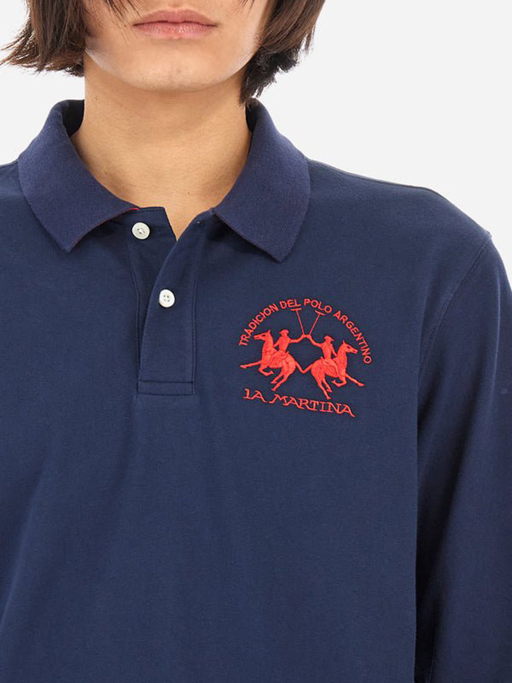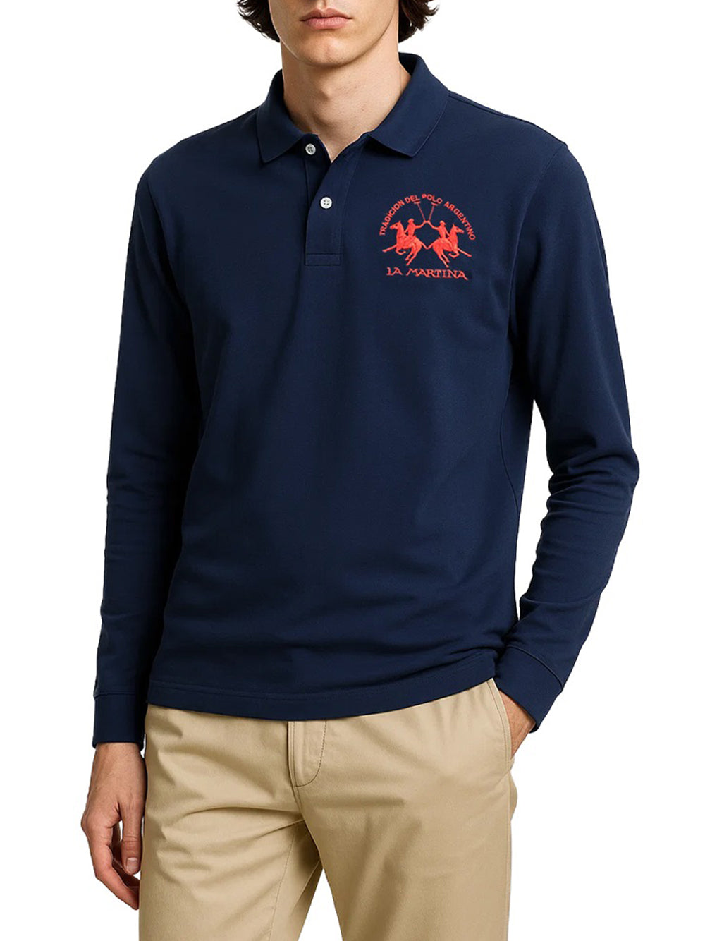 La Polo Regular La Martina da Uomo in blu è un capo immancabile nel guardaroba di ogni uomo. Questa polo a maniche lunghe è realizzata in piqué elasticizzato, offrendo una vestibilità confortevole e regolare. Il design classico con colletto e scollo a due bottoni è arricchito da un logo ricamato in colore a contrasto sul petto.